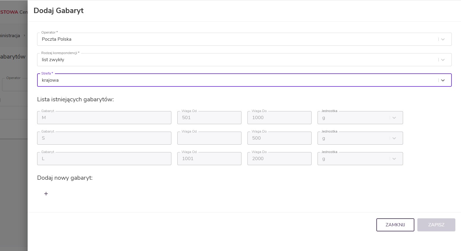 Na teście można wpisać kwoty z ogólnego cennika dostępnego na stronach poczty. Gabaryty w Administracji można ustawić - w podręczniku jest to dobrze opisane (https://podrecznik.ezdrp.gov.pl/zarzadzanie-gabarytami-przesylek/)